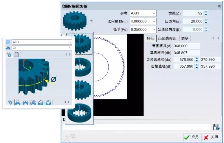 通过工艺图纸给出的参数,在齿轮创建窗口选择齿轮类型并输入相应的参数,创建完成后会在3D视图自动生成齿轮CAD数据。