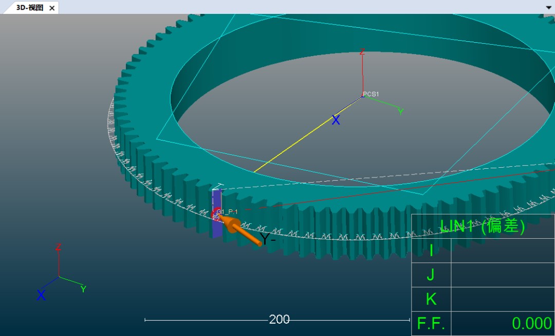 对齐是为了给齿轮每一个齿定位序列号,这里用“三、二、一”的对齐方式建立工件坐标系;工件坐标系建立后,测量系统会对每一个齿定位序列号,并自动生成测量程序、路径,最后可以跟随箭头指引操作,完成测量。