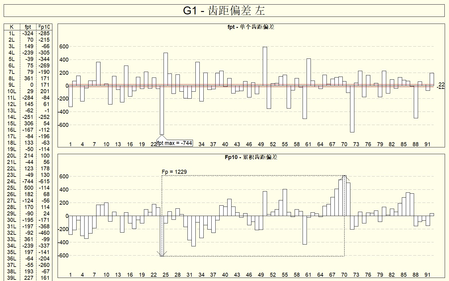 报告中会对齿轮的每一个齿进行评价,主要包括:齿距误差fpt、累计误差Fp、齿厚sn、公法线长度WK、径向跳动Fr、齿形总误差Fα、齿形形状误差ffα、齿形斜率误差fHα、齿向总误差Fβ、齿向形状误差ffβ、齿向斜率误差fHβ等数据参数。